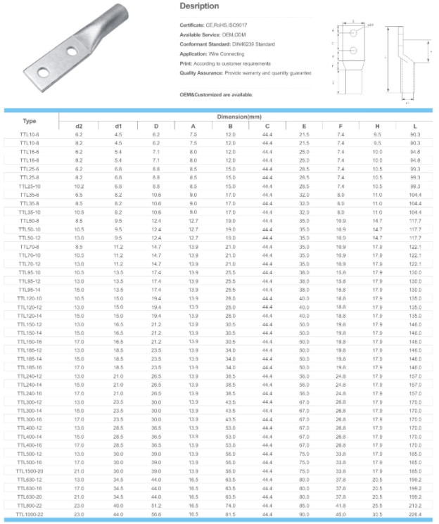 TTL/Tubular Cable Lugs With Two Connection Holes